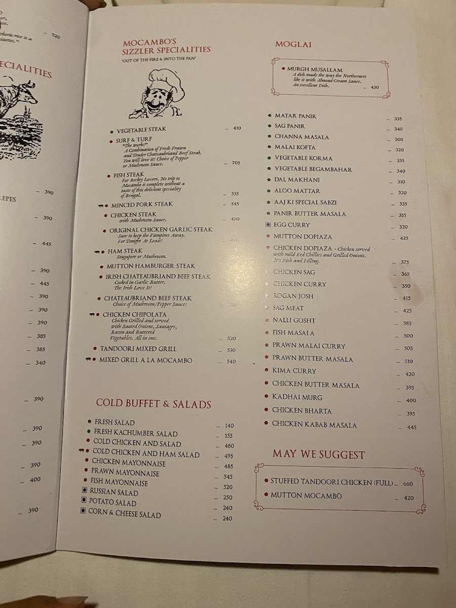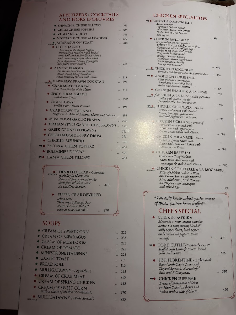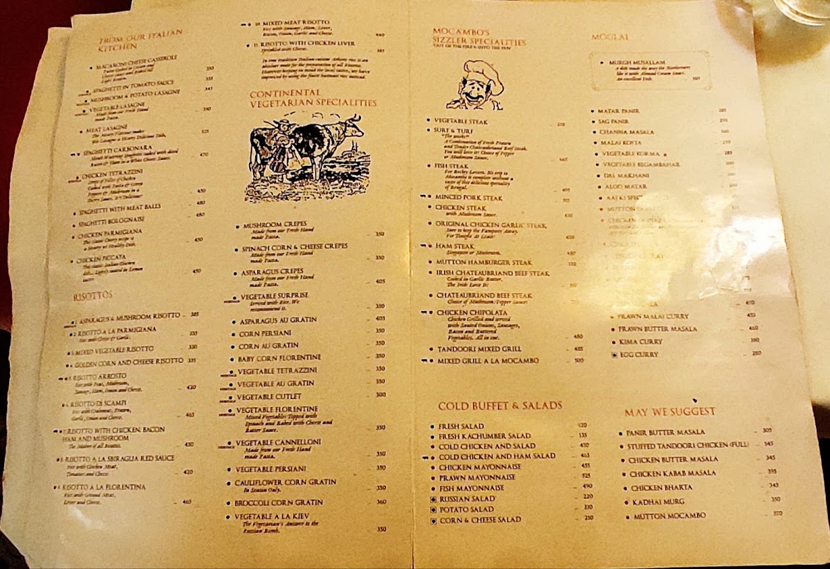 Mocambo Restaurant and Bar, nestled in the heart of Kolkata on Mirza Ghalib Street, invites you on a delightful culinary journey through its Continental menu. The offerings showcase a harmonious blend of flavors, with house specials like the Chicken Supreme, marinated to perfection and baked with a rich slab of cheese, and the Pork Cutlet, an exquisitely tasty dish packed with ham and cheese. Vegetarians can indulge in the freshly made Mushroom Crepes or the creamy Asparagus Au Gratin. For rice lovers, the selections, which include Fish Biryani and Peas Pulao, bring aromatic basmati and vibrant spices to the forefront. Patrons have praised their overall experience, from memorable dishes like Lobster Thermidor to the decadent Baked Alaska. With its warm ambiance and attentive service, Mocambo promises a dining experience that lingers in your memory.